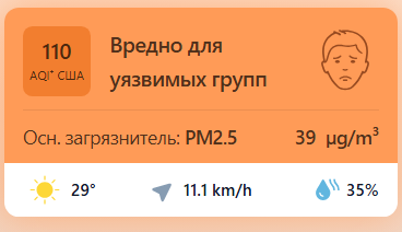 В 09:00 станция мониторинга в столице Узбекистана показывала результат в 110 AQI. Концентрация PM2.5 — в 8,3 раза выше рекомендуемого ВОЗ среднегодового значения качества воздуха.