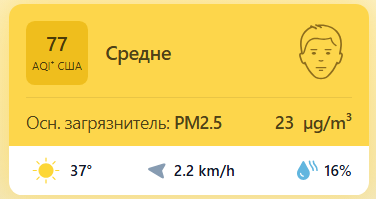 В 11:30 станция мониторинга в столице Узбекистана показывала результат в 77 AQI. Концентрация PM2.5 — в 4,6 раза выше рекомендуемого ВОЗ среднегодового значения качества воздуха.