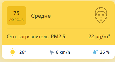 В 09:00 станция мониторинга в столице Узбекистана показывала результат в 75 AQI. Концентрация PM2.5 — в 4,4 раза выше рекомендуемого ВОЗ среднегодового значения качества воздуха.