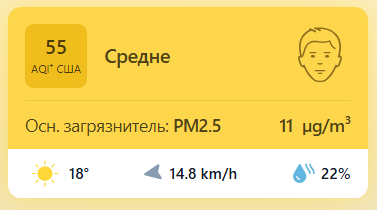 В 09:04 станция мониторинга в столице Узбекистана показывала результат в 55 AQI. Концентрация PM2.5 — в 2,2 раза выше рекомендуемого ВОЗ среднегодового значения качества воздуха.