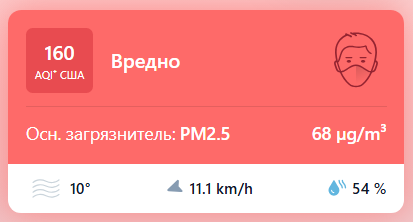В 08:55 станция мониторинга в столице Узбекистана показывала результат в 160 AQI. Концентрация PM2.5 — в 13,6 раза выше рекомендуемого ВОЗ среднегодового значения качества воздуха.
