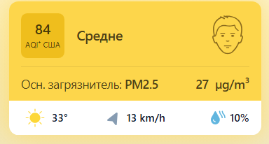 В 09:05 станция мониторинга в столице Узбекистана показывала результат в 84 AQI. Концентрация PM2.5 — в 5,4 раза выше рекомендуемого ВОЗ среднегодового значения качества воздуха.