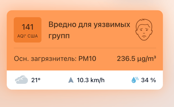 В 09:00 станция мониторинга в столице Узбекистана показывала результат в 141 AQI. Концентрация PM2.5 — в 8 раз выше рекомендуемого ВОЗ среднегодового значения качества воздуха.