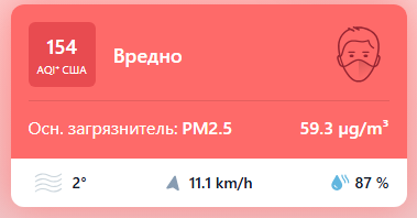 В 08:50 станция мониторинга в столице Узбекистана показывала результат в 154 AQI. Концентрация PM2.5 — в 11,9 раза выше рекомендуемого ВОЗ среднегодового значения качества воздуха.