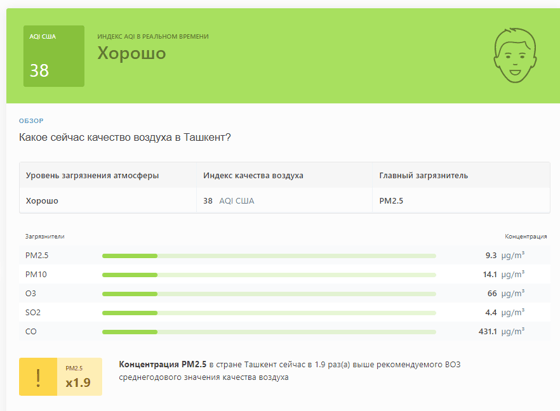В 08:15 станция мониторинга в столице Узбекистана показывала результат в 38 AQI. Концентрация PM2.5 — в 1,9 раза выше рекомендуемого ВОЗ среднегодового значения качества воздуха.