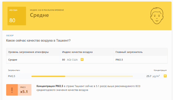 В 09:10 станция мониторинга в столице Узбекистана показывала результат в 80 AQI. Концентрация PM2.5 — в 5,1 раза выше рекомендуемого ВОЗ среднегодового значения качества воздуха.