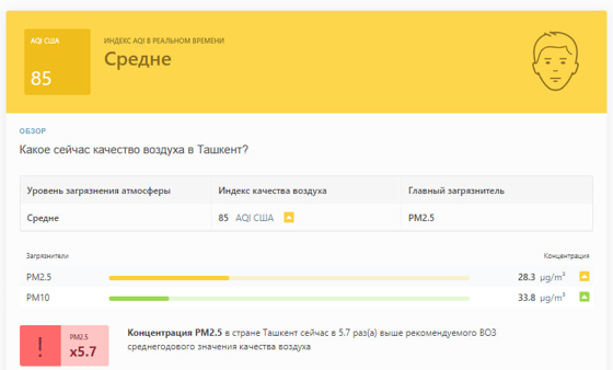 В 10:00 станция мониторинга в столице Узбекистана показывала результат в 85 AQI. Концентрация PM2.5 — в 5,7 раза выше рекомендуемого ВОЗ среднегодового значения качества воздуха.