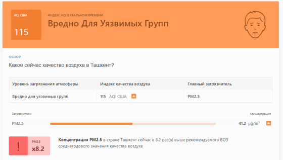 В 08:55 станция мониторинга в столице Узбекистана показывала результат в 115 AQI. Концентрация PM2.5 — в 8,2 раза выше рекомендуемого ВОЗ среднегодового значения качества воздуха.