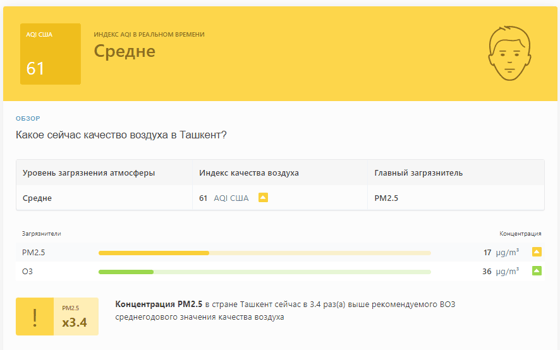 В 08:15 станция мониторинга в столице Узбекистана показывала результат в 61 AQI. Концентрация PM2.5 — в 3,4 раза выше рекомендуемого ВОЗ среднегодового значения качества воздуха.