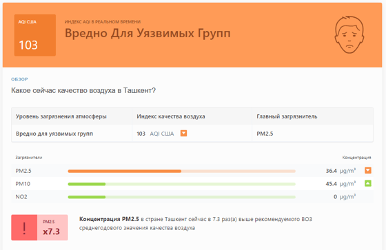 В 08:50 станция мониторинга в столице Узбекистана показывала результат в 103 AQI. Концентрация PM2.5 — в 7,3 раза выше рекомендуемого ВОЗ среднегодового значения качества воздуха.