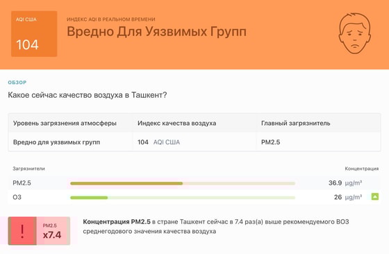 В 11:00 станция мониторинга в столице Узбекистана показывала результат в 104 AQI. Концентрация PM2.5 — в 7,4 раза выше рекомендуемого ВОЗ среднегодового значения качества воздуха.