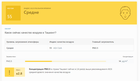 В 10:00 станция мониторинга в столице Узбекистана показывала результат в 55 AQI. Концентрация PM2.5 — в 2,8 раза выше рекомендуемого ВОЗ среднегодового значения качества воздуха.