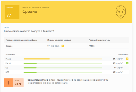 В 09:10 станция мониторинга в столице Узбекистана показывала результат в 77 AQI. Концентрация PM2.5 — в 4,9 раза выше рекомендуемого ВОЗ среднегодового значения качества воздуха.