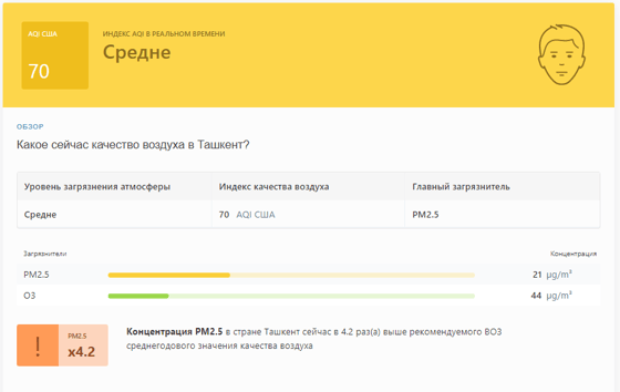 В 07:00 станция мониторинга в столице Узбекистана показывала результат в 70 AQI. Концентрация PM2.5 — в 4,2 раза выше рекомендуемого ВОЗ среднегодового значения качества воздуха.