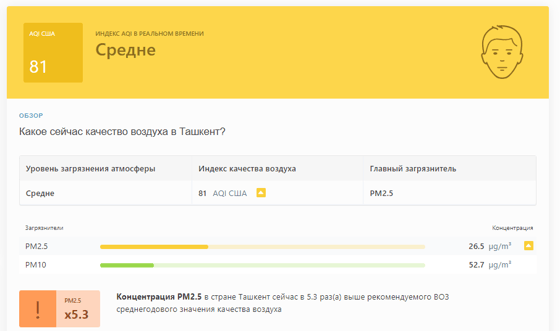 В 08:55 станция мониторинга в столице Узбекистана показывала результат в 81 AQI. Концентрация PM2.5 — в 5,3 раза выше рекомендуемого ВОЗ среднегодового значения качества воздуха.