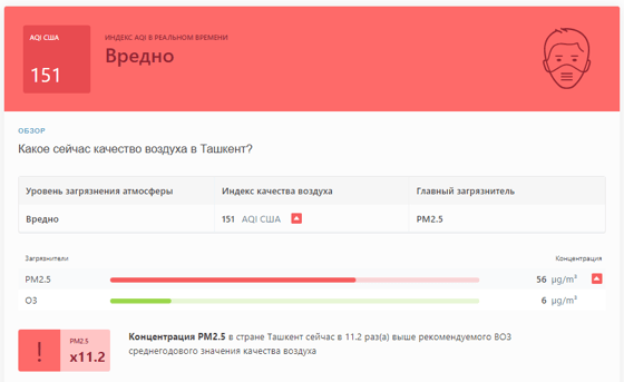 В 09:05 станция мониторинга в столице Узбекистана показывала результат в 151 AQI. Концентрация PM2.5 — в 11,2 раза выше рекомендуемого ВОЗ среднегодового значения качества воздуха.