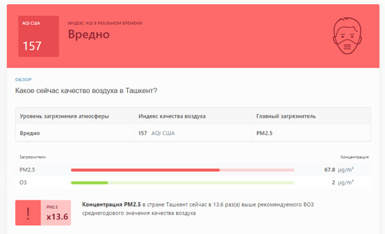 В 08:55 станция мониторинга в столице Узбекистана показывала результат в 157 AQI. Концентрация PM2.5 — в 13,6 раз выше рекомендуемого ВОЗ среднегодового значения качества воздуха.