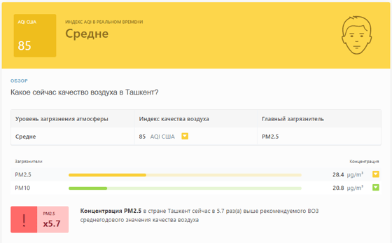 В 09:30 станция мониторинга в столице Узбекистана показывала результат в 85 AQI. Концентрация PM2.5 — в 5,7 раза выше рекомендуемого ВОЗ среднегодового значения качества воздуха.