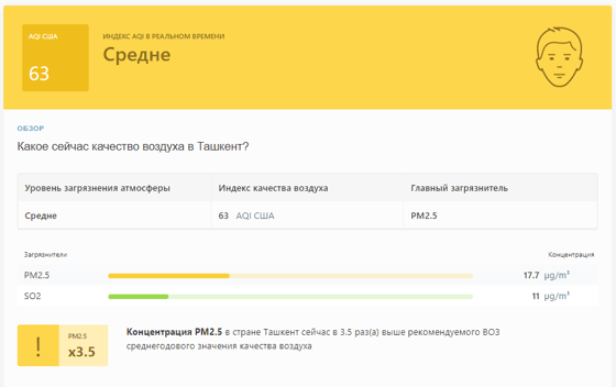 В 08:05 станция мониторинга в столице Узбекистана показывала результат в 63 AQI. Концентрация PM2.5 — в 3,5 раза выше рекомендуемого ВОЗ среднегодового значения качества воздуха.