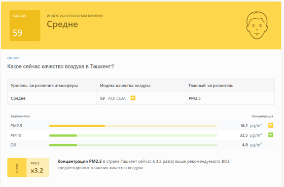 В 08:55 станция мониторинга в столице Узбекистана показывала результат в 59 AQI. Концентрация PM2.5 — в 3,2 раза выше рекомендуемого ВОЗ среднегодового значения качества воздуха.