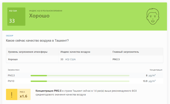 В 08:55 станция мониторинга в столице Узбекистана показывала результат в 33 AQI. Концентрация PM2.5 — в 1,6 раза выше рекомендуемого ВОЗ среднегодового значения качества воздуха.
