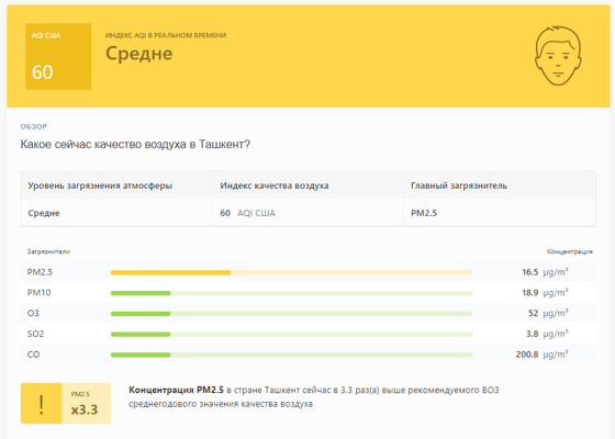 В 08:00 станция мониторинга в столице Узбекистана показывала результат в 60 AQI. Концентрация PM2.5 — в 3,3 раза выше рекомендуемого ВОЗ среднегодового значения качества воздуха.