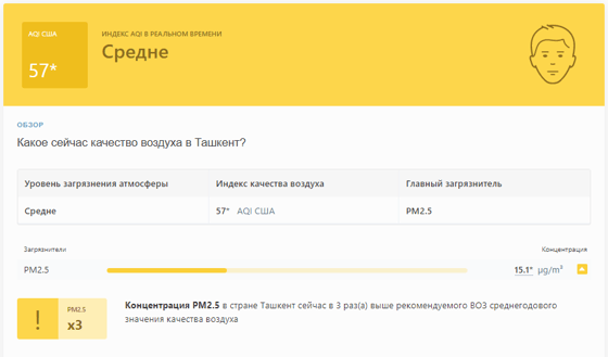 В 08:10 станция мониторинга в столице Узбекистана показывала результат в 57 AQI. Концентрация PM2.5 — в 3 раза выше рекомендуемого ВОЗ среднегодового значения качества воздуха.