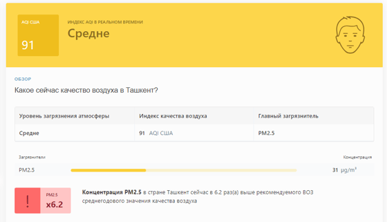 В 08:55 станция мониторинга в столице Узбекистана показывала результат в 91 AQI. Концентрация PM2.5 — в 6,2 раза выше рекомендуемого ВОЗ среднегодового значения качества воздуха.