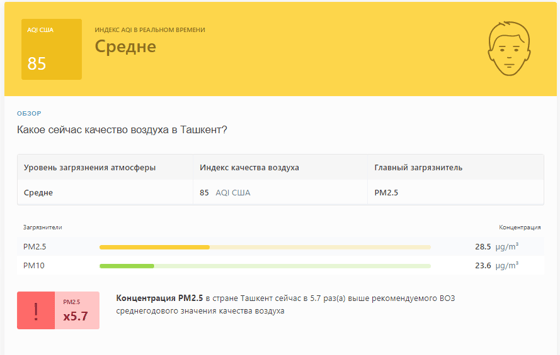 В 08:10 станция мониторинга в столице Узбекистана показывала результат в 85 AQI. Концентрация PM2.5 — в 5,7 раза выше рекомендуемого ВОЗ среднегодового значения качества воздуха.