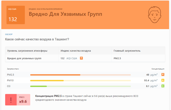 В 08:30 станция мониторинга в столице Узбекистана показывала результат в 132 AQI. Концентрация PM2.5 — в 9,6 раза выше рекомендуемого ВОЗ среднегодового значения качества воздуха.
