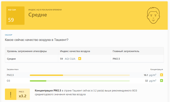 В 09:05 станция мониторинга в столице Узбекистана показывала результат в 59 AQI. Концентрация PM2.5 — в 3,2 раза выше рекомендуемого ВОЗ среднегодового значения качества воздуха.