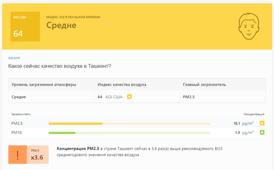 В 09:30 станция мониторинга в столице Узбекистана показывала результат в 64 AQI. Концентрация PM2.5 — в 3,6 раза выше рекомендуемого ВОЗ среднегодового значения качества воздуха.