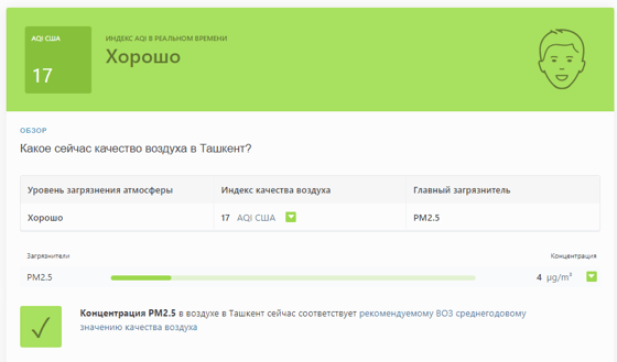 В 08:35 станция мониторинга в столице Узбекистана показывала результат в 17 AQI. Концентрация PM2.5 соответствует рекомендуемому ВОЗ среднегодовому значению качества воздуха.