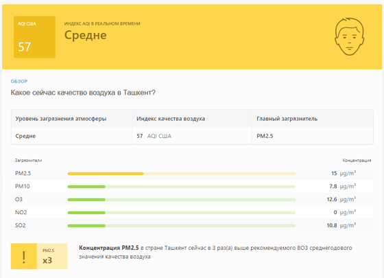 В 09:05 станция мониторинга в столице Узбекистана показывала результат в 57 AQI. Концентрация PM2.5 — в 3 раза выше рекомендуемого ВОЗ среднегодового значения качества воздуха.