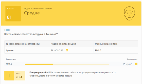 В 08:15 станция мониторинга в столице Узбекистана показывала результат в 61 AQI. Концентрация PM2.5 — в 3,4 раза выше рекомендуемого ВОЗ среднегодового значения качества воздуха.