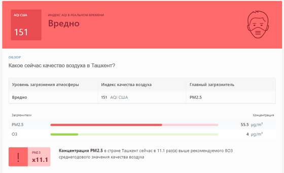 В 09:05 станция мониторинга в столице Узбекистана показывала результат в 151 AQI. Концентрация PM2.5 — в 11,1 раза выше рекомендуемого ВОЗ среднегодового значения качества воздуха.