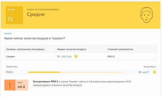 В 09:50 станция мониторинга в столице Узбекистана показывала результат в 72 AQI. Концентрация PM2.5 — в 4,4 раза выше рекомендуемого ВОЗ среднегодового значения качества воздуха.