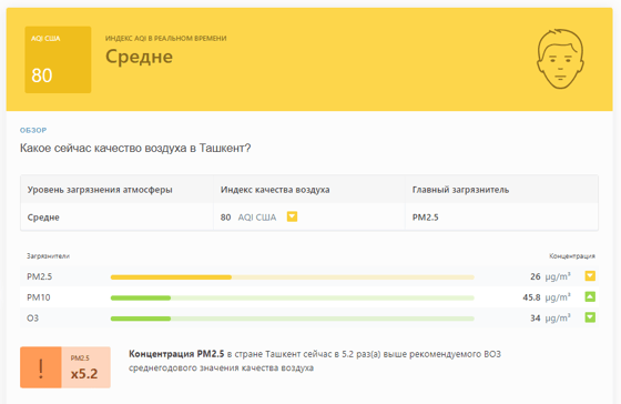 В 08:30 станция мониторинга в столице Узбекистана показывала результат в 80 AQI. Концентрация PM2.5 — в 5,2 раза выше рекомендуемого ВОЗ среднегодового значения качества воздуха.