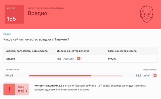 В 11:15 станция мониторинга в столице Узбекистана показывала результат в 155 AQI. Концентрация PM2.5 — в 12,7 раза выше рекомендуемого ВОЗ среднегодового значения качества воздуха.