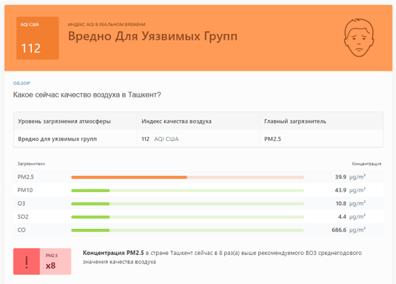 В 08:20 станция мониторинга в столице Узбекистана показывала результат в 112 AQI. Концентрация PM2.5 — в 8 раз выше рекомендуемого ВОЗ среднегодового значения качества воздуха.