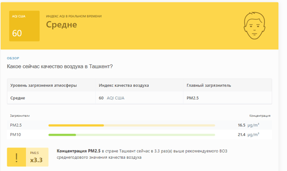В 08:10 станция мониторинга в столице Узбекистана показывала результат в 60 AQI. Концентрация PM2.5 — в 3,3 раза выше рекомендуемого ВОЗ среднегодового значения качества воздуха.