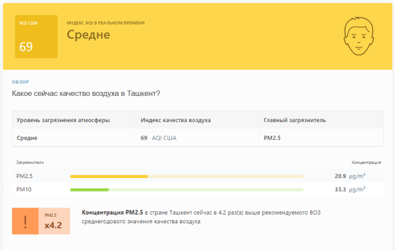 В 08:10 станция мониторинга в столице Узбекистана показывала результат в 69 AQI. Концентрация PM2.5 — в 4,2 раза выше рекомендуемого ВОЗ среднегодового значения качества воздуха.