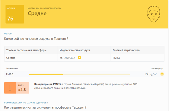 В 08:40 станция мониторинга в столице Узбекистана показывала результат в 76 AQI. Концентрация PM2.5 — в 4,8 раза выше рекомендуемого ВОЗ среднегодового значения качества воздуха.