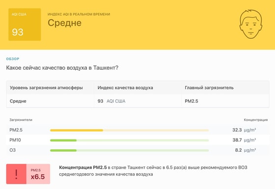В 10:10 станция мониторинга в столице Узбекистана показывала результат в 93 AQI. Концентрация PM2.5 — в 6,5 раз выше рекомендуемого ВОЗ среднегодового значения качества воздуха.