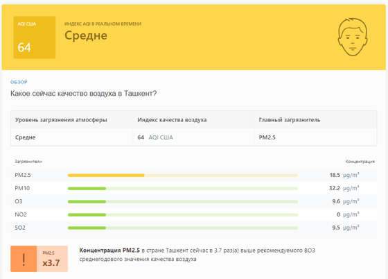 В 09:05 станция мониторинга в столице Узбекистана показывала результат в 64 AQI. Концентрация PM2.5 — в 3,7 раза выше рекомендуемого ВОЗ среднегодового значения качества воздуха.