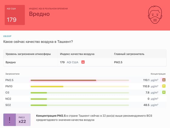 В 11:00 станция мониторинга в столице Узбекистана показывала результат в 179 AQI. Концентрация PM2.5 — в 22 раза выше рекомендуемого ВОЗ среднегодового значения качества воздуха.