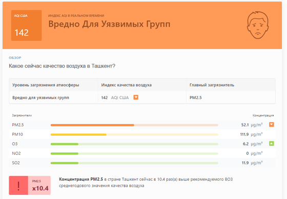 В 09:10 станция мониторинга в столице Узбекистана показывала результат в 142 AQI. Концентрация PM2.5 — в 10,4 раза выше рекомендуемого ВОЗ среднегодового значения качества воздуха.