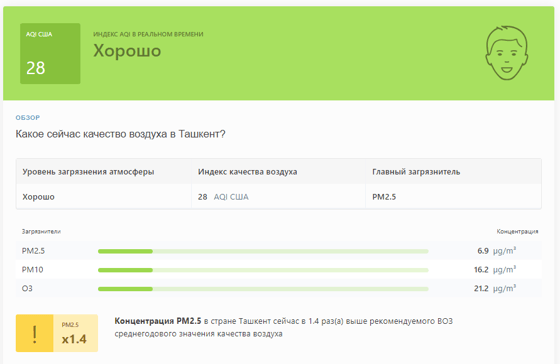 В 08:55 станция мониторинга в столице Узбекистана показывала результат в 28 AQI. Концентрация PM2.5 — в 1,4 раза выше рекомендуемого ВОЗ среднегодового значения качества воздуха.