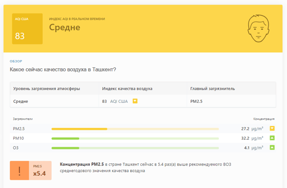 В 08:50 станция мониторинга в столице Узбекистана показывала результат в 83 AQI. Концентрация PM2.5 — в 5,4 раза выше рекомендуемого ВОЗ среднегодового значения качества воздуха.