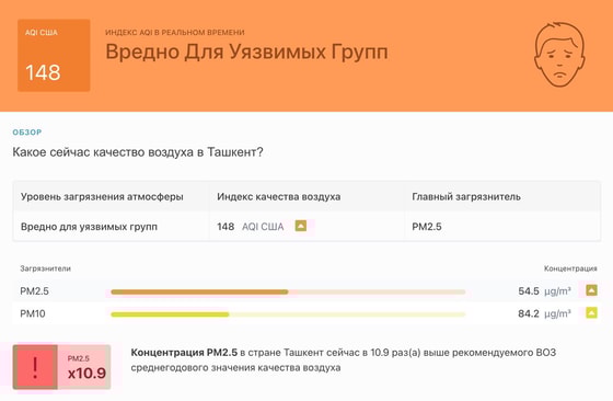 В 11:15 станция мониторинга в столице Узбекистана показывала результат в 148 AQI. Концентрация PM2.5 — 10,9 раз выше рекомендуемого ВОЗ среднегодового значения качества воздуха.